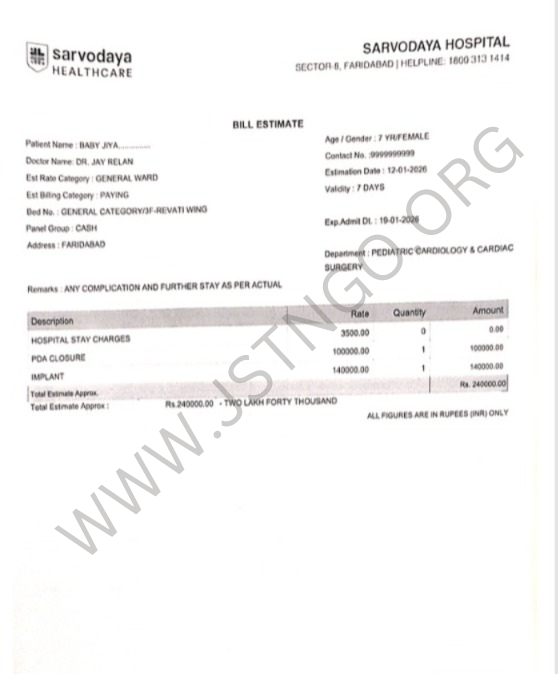 Baby Jiya comes from a financially underprivileged family. Her father is a Goat Keeper and the sole earning member of the family, with a very limited and unstable income. Managing daily household expenses itself is a challenge, making it extremely difficult for the family to afford specialized cardiac treatment.